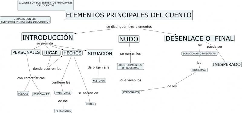 · el argumento o trama · la secuencia · los personajes. Las acciones El argumento, llamado también trama, es el encadenamiento de los sucesos. La secuencia es el orden en que aparecen los acontecimientos en la historia. Dentro de éste se señalan los siguientes momentos: a) Planteamiento. Se muestra la situación inicial del relato. Se señalan el tiempo y el lugar en los que el cuento se desarrolla y, simultáneamente, se presenta a los personajes principales. En algunos relatos esta parte se omite y los personajes van apareciendo a lo largo de la historia. b) Desarrollo. Encadenamiento de acciones. Sucesos y acciones. c) Clímax o nudo. d) Desenlace. ![]() |